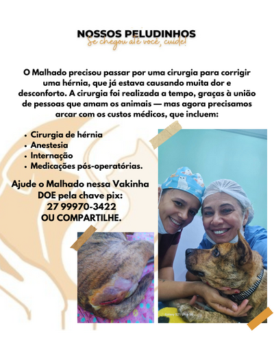Malhado precisou passar por uma cirurgia para corrigir uma hérnia, que já estava causando muita dor e desconforto. A cirurgia foi realizada a tempo, graças à união de pessoas que amam os animais — mas agora precisamos arcar com os custos médicos, que incluem: