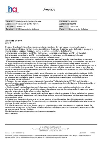 Hoje, segundo os próprios médicos, o tratamento que pode dar a ela uma chance de vida é a imunoterapia, que pode reduzir a doença, estabilizar o câncer, aumentar o tempo de vida e melhorar a qualidade de vida.