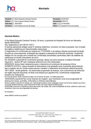 Enquanto deveria estar vivendo o momento mais feliz da sua vida, ela está enfrentando uma batalha muito dura contra um câncer agressivo, um melanoma maligno em estágio IV, já com metástases em ossos, pulmões e linfonodos.