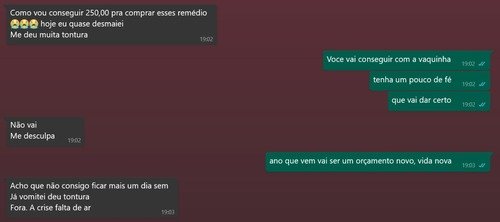 Eu me chamo Natã Ribeiro Barbosa, e venho pedir a sua ajuda para uma amiga que conheci em março de 2024 no trabalho, hoje ela esta tendo uma situação muito dificil sem comida alguma para cozinhar pra ela e para os 2 filhos, esta com problemas de depressão e ansiedade, os remédios acabaram e ela depende muito deles urgentemente.