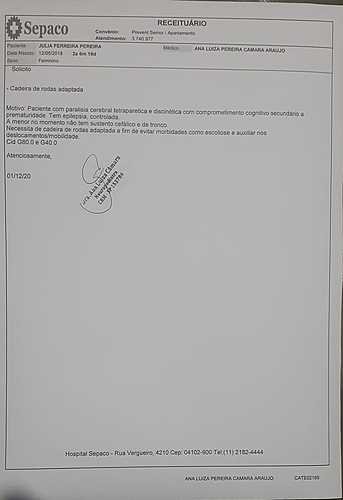 A neurologista pediu para meus pais comprarem uma cadeira de rodas adaptada para evitar morbidades e auxiliar no meu deslocamento.