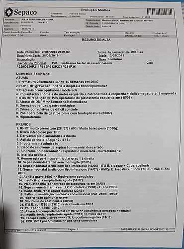 Eu nasci prematura de 28 semanas, fiquei internada cerca de 293 dias (9 meses). Tive alguns complicações como Hipertensão pulmonar, Displasia Bronco pulmonar, mais de 4 paradas respiratórias, umas com mais de 5 minutos de parada, convulsões e outras enfermidades... é foram dias bem dificieis, deve ser por isso que me chamam de milagre rsrs