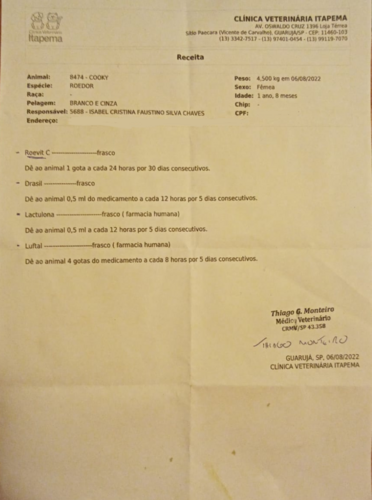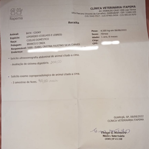 Ola pessoa meu nome é Isabel, criei essa vaquinha pra arrecadar dinheiro pra ultrassom da minha coelhinha, já tem 1 semana que eu notei que ela não come a ração, só bebe água na seringa, não faz uma de suas necessidades básicas, passei ela no veterinário de animais silvestres a consulta e os remédios saíram por base de R$493,00 . Ela precisa fazer essa ultrassom para ele me dizer o que ela tem , peço a colaboração de todos para mais informações esse é o insta dela @_kooky_bunny é só me chamar lá .