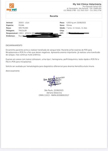 Mesmo após os exames (PCR para micoplasmose, FIV e FeLV — todos negativos), ela continua muito anêmica e agora precisa de novos cuidados e avaliação com hematologista para investigação de Anemia Hemolítica Autoimune.