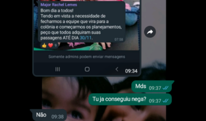 Mesmo ela trabalhando em 2 empregos nao tem como suprir o valor da passagem, ela recebeu uma mensagem avisando que tendo em vista que precisam fechar a equipe para a colônia e começar os planejamentos é necessário que consigam adquirir as passagens até o dia 30 de novembro.