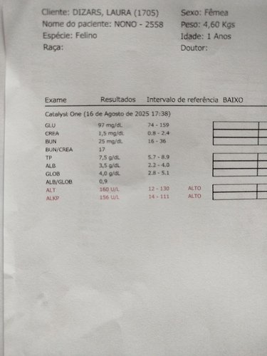 Os resultados deram alteração no fígado, suas enzimas hepáticas estão aumentadas, ALKP e ALT altos, e a doutora disse que deveríamos fazer um ultrassom.
