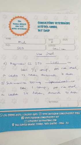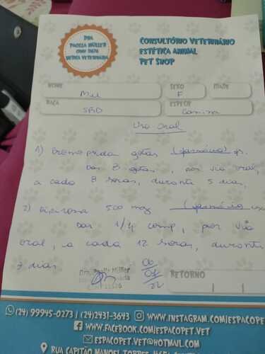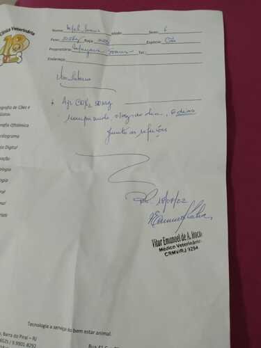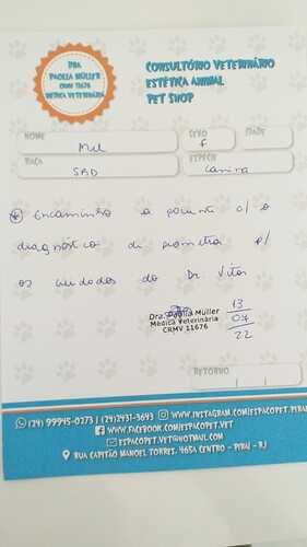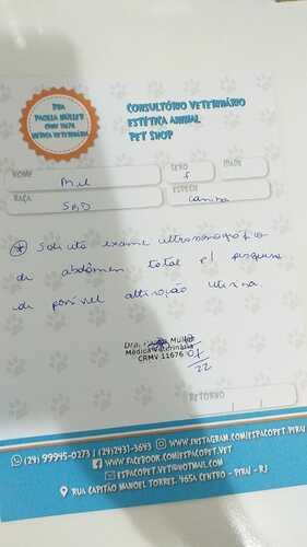 recente comecei a vomitar e minha mãe e vovô acharam que eu tinha comido algo que me fez mal. porém os vômitos não pararam e minha mãe me levou na tia Paola, lá ela me examinou e fizemos um exame de sangue para verificar, pois com o exame fisíco não foi encontrado nada. meu exame ficou pronto e veio mostando infecção, logo começamos um antibiótico, juntamente com a medicação para dor. porém minha mãe reparou que estava saindo secreção dos meus seios, foi ai então que a tia Paola solicitou uma ultrassom para verificar pois tinha duas suspeitas gravidez piscologica ou piometra. fiz a ultrassom e fui diagnostica com uma piometra. com isso tia Paola me encaminhou para cirurgia. Mamãe me levou para o Tio Vitor que fez minha ultra para fazer minha cirurgia. dia 18/07 fiz os exames pré operatório e no mesmo dia a cirurgia. Já estou em casa e tomando medicações para dor, antibiótico.