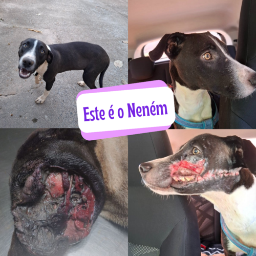 Este é o Neném! Ele é um cãozinho de rua que eu ajudo a cuidar. É um garoto de uns 10 meses apenas e sofreu um ataque de outro cachorro que desfigurou a face dele. Um anjo o resgatou e levou ao veterinário que cuidou, fez cirurgia de castração e de reconstrução da face. Agora, ele teve alta e não pode voltar as ruas porque preciso terminar o processo de recuperação da face.
