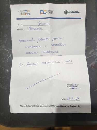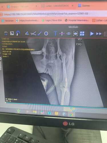 A pandora foi atropelada no Complexo do Alemão, foi socorrida e levada ao hospital de Caxias, onde não há especialista em ortopedia. Foram feitos raio x, ultra e exame de sangue, que apontaram um deslocamento no fêmur além da doença do carr ver tudo
