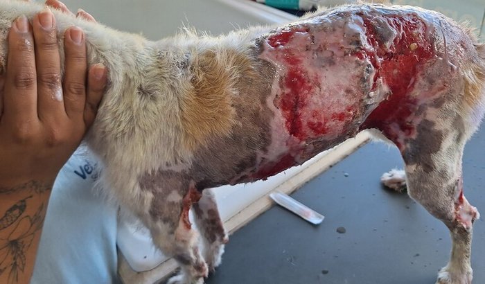 Infelizmente, a Pepa foi quem mais sofreu. Grande parte do seu corpo foi atingida, resultando em queimaduras de terceiro grau. Ela precisou ficar internada por vários dias e agora segue um tratamento intenso, com curativos diários, uso de medicações e pomadas de alto custo, além de acompanhamento veterinário constante.