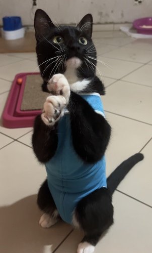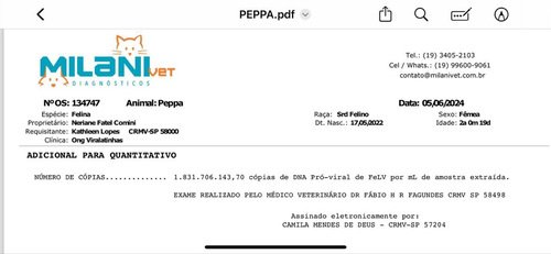 O pós cirúrgico foi bem difícil, usou roupinha cirúrgica por mais de 1 mês e teve muita produção de leite. Mesmo assim ela foi uma menina super poderosa e forte! Hoje ela demanda muitos cuidados de alto custo por causa da FeLV, seu primeiro PCR quantitativo de DNA Pró-Viral deu acima de 1 bilhão de carga viral (progressiva). O segundo, PCR de RNA Viral, acima de 266 milhões. Em setembro de 2024, iniciamos quimioterapia e ela foi encerrada em maio de 2025, após uma reavaliação com nova oncologista. Estamos livres da quimio! A Peppa não precisa desse tratamento.