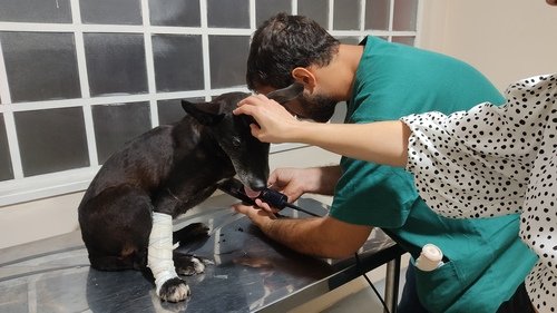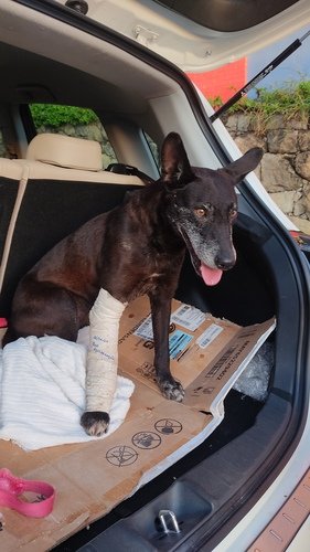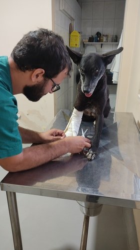 Foi então que colocamos a cachorrinha dentro do carro e levamos para a clínica, onde ela foi bem atendida. Foi feita a troca do enfaixamento e uma imobilização mais apropriada, além de analgésicos e internação.
