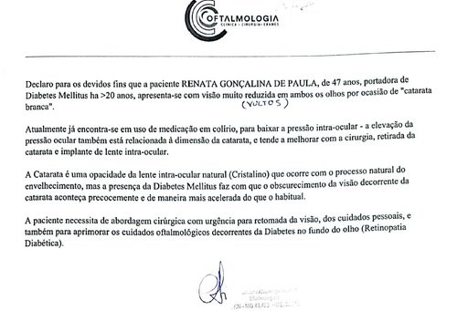 Mas a Renata não pode esperar mais o SUS, pois está perdendo a visão total e precisa fazer a cirurgia URGENTE nos dois olhos. E seu processo de recuperação será mais lento devido ao quadro da diabetes.