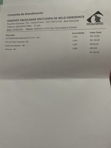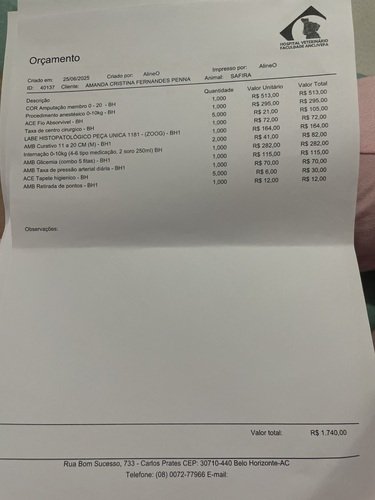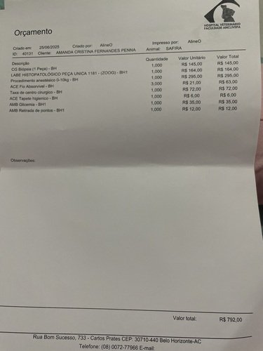Voltei ao veterinário no dia de hoje 25/06 para retorno e ver o resultados dos exames e foi constatado que ela estava com câncer. O cirurgião veterinário informou que provavelmente seria um câncer maligno, já que começou na pata traseira e hoje já apareceu nódulos na coluna e nas mamas. A proposta do cirurgião veterinário é realizar uma biópsia, para identificar o tipo de câncer e amputar a pata dela traseira. Os exames que falta para realizar é um Rx abdominal, eletrocardiograma e ultrassom no valor de 294,00 reaisA biópsia está saindo no valor de 792,00 reais e a cirurgia para amputação da pata traseira está saindo em torno de 1.740,00 reais com apenas um dia de internação. Ela também irá precisar de passar com um especialista oncológico, para acompanhar a evolução do câncer e vê se vai ser necessário fazer quimioterapia.
