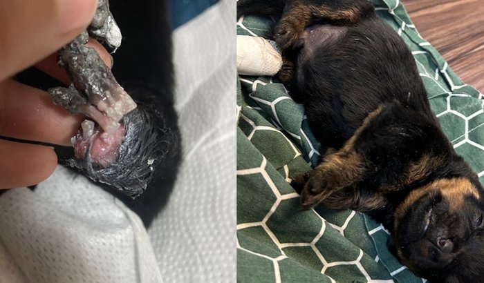 O Bebeto é um filhotinho de Rottweiler de apenas 18 dias que já passou por mais dor do que qualquer bebê deveria. Encontramos ele com a patinha devorada por miíase, e ela acabou caindo. Mesmo assim, ele continua lutando.
