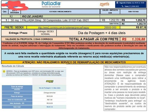 Abaixo está a receita e o orçamento do medicamento que preciso tomar, chamado Palladia. Esse valor é de 1 caixa com 30 comprimidos.