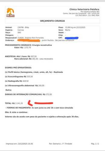 Atualização: ele passou pela cirurgia e o orçamento total com anestesia, internação, procedimento e medicação ficou em R$3.141, sem contar com os R$1.033 dos procedimentos de emergência.
