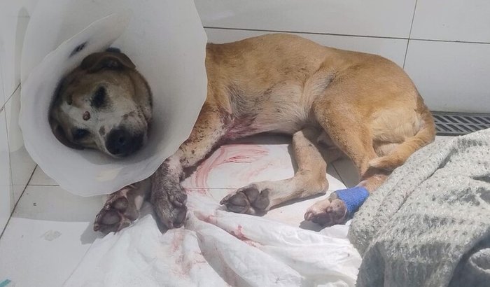 Resgatamos ele hoje aqui na rua de casa, algum carro soltou ele no meio da rua e ele acabou sendo atropelado, o responsável pelo atropelamento não acolheu também. Ele é bem velhinho, praticamente cego dos dois olhos e parece ter sinais de câncer.