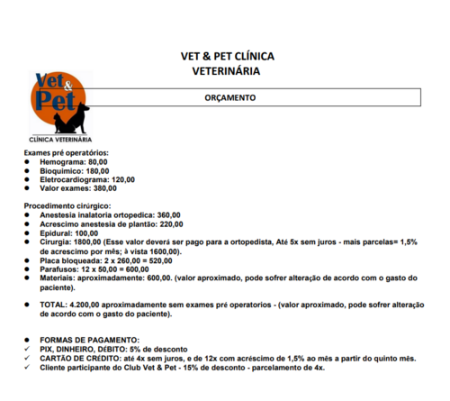 O custo da cirurgia é estimado em R$ 4.689,00 conforme os documentos emitidos pelo veterinário que a atendeu (documentos em anexo). Hoje, venho humildemente pedir a vocês, pessoas de bom coração, para unirmos forças e ajudarmos a custear essa intervenção vital.