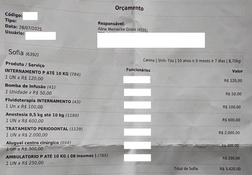 O valor estimado da cirurgia (incluindo exames, anestesia e o pós-operatório) gira em torno de R$3.500. Infelizmente, não conseguimos arcar com esse custo sozinhos no momento, pois além da Sofia, também cuidamos do seu irmão, o Jumbinho, que enfrenta diversos problemas de saúde e requer cuidados e gastos mensais constantes com medicação, exames e alimentação especial.