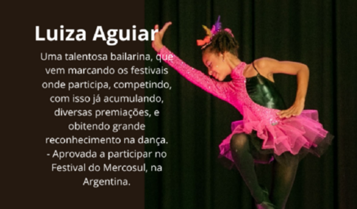 Vamos ajuda a talentosa bailarina, Luiza Aguiar com mas este feito, dançar fora do país, no Festival de Dança do Mercosul, em setembro deste ano, realizado na Argentina.