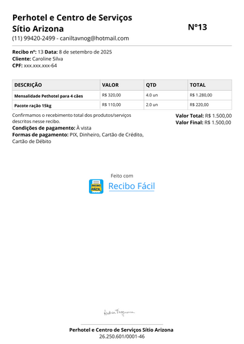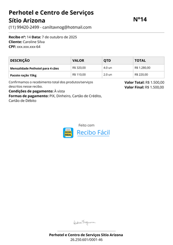 RECIBO SETEMBRO / LAR TEMPORÁRIO + RAÇÃO