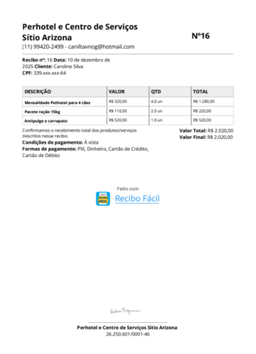 RECIBO DEZEMBRO / LAR TEMPORÁRIO + RAÇÃO + ANTIPULGAS