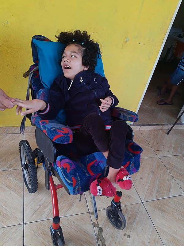A Erica espera conseguir uma cadeira de rodas adequada para a filha, já que a que ela tem é de um adulto e está afetando a coluna da menina, pois ela fica solta na cadeira.