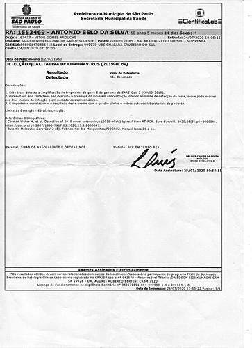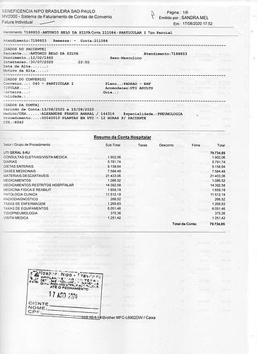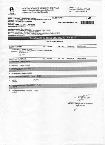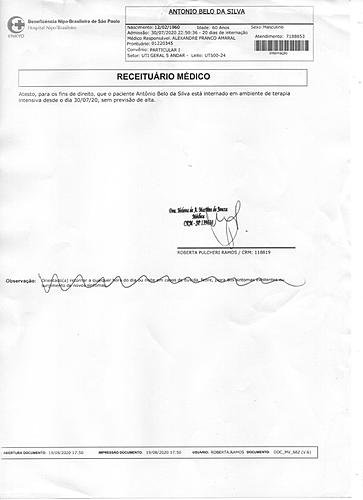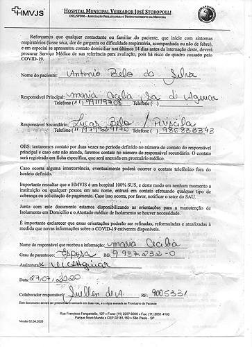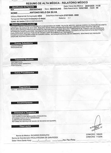 Mesmo com todos os exames e a oscilação na oxigenação, para nossa surpresa, no dia 29 de julho ele recebeu alta do hospital público. Em menos de 24 horas após a alta do hospital, nosso pai apresentou complicações e o levamos para o Hospital Nipo Brasileiro para sua consulta de retorno. Foi diagnosticado que ele já estava em um grau avançado de pneumonia, com 50% do pulmão comprometido, sendo necessário dar entrada na UTI, pois o seu estado naquele momento era grave.