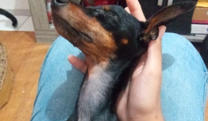 Eu sou Luiza. Resgatei essa filhote de Pincher. Consultei ela e descobrimos que tem cinomose, uma doença que não tem cura mas tem tratamento para aliviar os sintomas.
