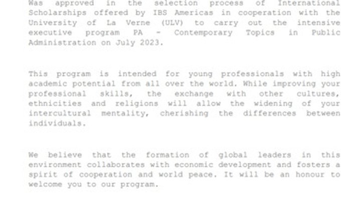 Em 2 de fevereiro recebi o resultado da inscrição e me surpreendi ao ver que fui um dos 15 selecionados e contemplados pela University of La Verne com uma bolsa de 50% para um curso de verão em julho de 2023 na área: Contemporary Topics in Public Administration.