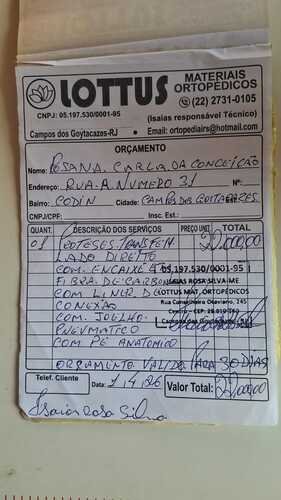 Diferente de muitas campanhas, nós já temos o orçamento fechado. O laudo da Lottus Materiais Ortopédicos está anexado nas fotos desta página para total transparência. A prótese (com encaixe em fibra de carbono, liner e joelho pneumático) custa exatos R$ 22.000,00. Nossa meta de R$ 24.000,00 serve apenas para cobrir as taxas operacionais do site e garantir que os 22 mil cheguem líquidos para a compra.