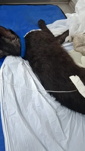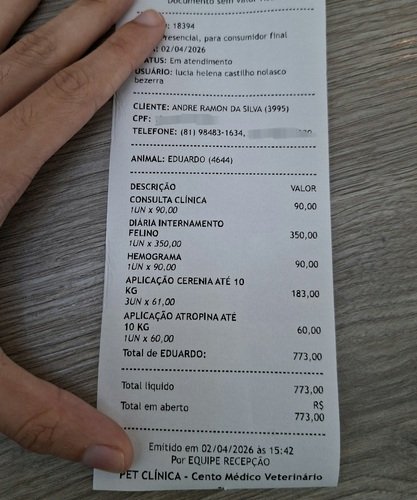 Os custos da clinica acabaram sendo altos (segue recibo da primeira diária) devido a condição dele e os procedimentos, exames e medicamentos necessários pra o estabilizar e principalmente a diária de internação. A primeira diária que ele passou não foi o suficiente pra melhorar significativamente a situação dele pois ele ainda está bem fraco e desidratado, sem se alimentar corretamente e o seu exame de sangue ainda mostrou uma infecção que precisa ser tratada a longo prazo, fizemos a renovação da diária (não sabemos quantas mais irá ser necessário) e ele irá passar por mais exames e irá receber medicamentos para que o corpo dele consiga aguentar e expulsar o efeito do veneno que ingeriu.