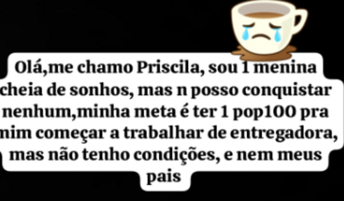 Olá,me chamo Priscila, sou 1 menina cheia de sonhos, mas n posso conquistar nenhum,minha meta é ter 1 pop100 pra mim começar a trabalhar de entregadora, mas não tenho condições, e nem meus pais ver tudo