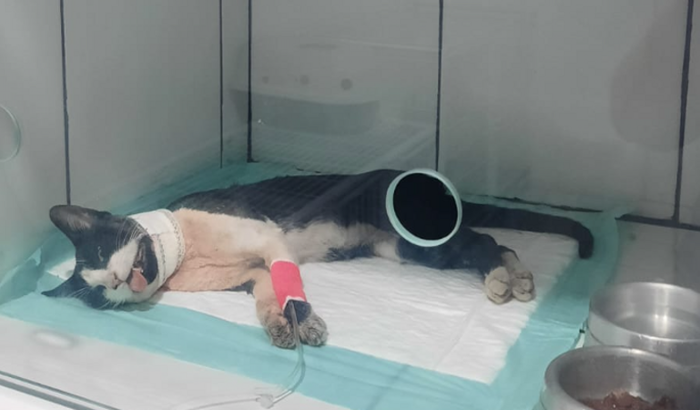 Ele é um gato de rua que apareceu na minha casa todo machucado com um grande ferimento no pescoço onde teve que passar por cirurgia. Já está internado há 7 dias. Está se recuperando, mas ele precisa continuar internado pois os pontos abriram e a ferida está exposta. Até o momento a conta na clínica veterinária está em R$ 1.530,00.