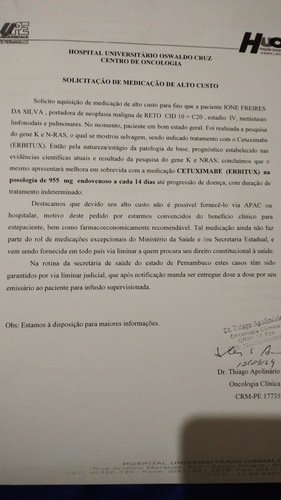 O Ione está na luta contra o câncer que foi diagnosticado no ano de 2024 . Encontra-se internado no Hospital Oswaldo Cruz .Ele precisa comprar um medicamento de alto custo, para ajudar no tratamento por tempo indeterminado até a progressão da doença. Remédio : Erbitux 500mg/100ml (4 frascos por mês)Custa em torno de R$ 7.000,00 reais cada frasco , por mês ele precisa tomar 4 frascos , totalizando R$ 28.000,00 por mês .