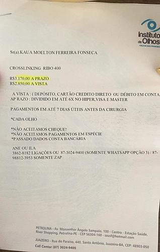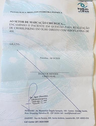 Kauã tem 16 anos, e foi diagnosticado com uma doença ocular chamada ceratocone. O ceratocone é uma doença que causa afinamento e protrusão da córnea causando baixa visão devido ao astigmatismo irregular induzido. Com isso ele necessita realizar um procedimento chamado Crosslinking em ambos os olhos. Se não for realizado pode levar à perda visual importante e irá ter a necessidade de um transplante de córnea. Kauã tem bastante dificuldade para enxergar, sua visão é totalmente turva, ele faz uso de óculos de grau, mas mesmo assim tem bastante dificuldade para enxergar. Se o procedimento não for realizado dentro de um mês, ele terá que retornar ao médico e refazer todos os exames novamente, tendo mais gastos, além da sua doença continuar progredindo.