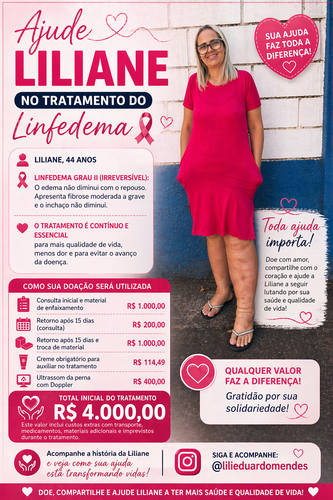 Estamos realizando esta vaquinha para ajudar Liliane, de 44 anos, que foi diagnosticada com Linfedema Grau II, estágio em que o inchaço já não diminui com repouso e há presença de fibrose moderada a grave, tornando a condição irreversível e exigindo tratamento contínuo e especializado. Essa situação causa dor, desconforto, limitação nos movimentos e afeta diretamente sua qualidade de vida.