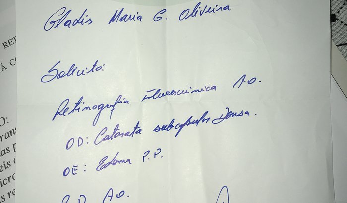 "AO: Meios pouco transparentes devido à opacidades sub-capsulares posteriores nos cristalinos, mas principalmente do OD. Sinais compatíveis com retinopatia diabética plana, caracterizada pela presença de múltiplos micro-aneurismas e micro hemorragias. Edemas focais retinianos em AO, mas principalmente em OE."