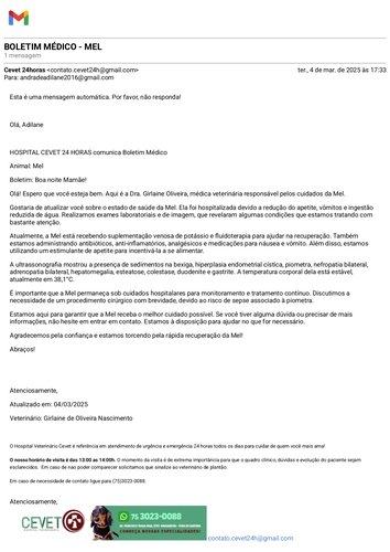 A cirurgia já foi realizada, pois não havia tempo a perder, mas agora preciso de ajuda para cobrir os custos do procedimento, além de medicamentos, exames e todos os cuidados pós-cirúrgicos que garantirão a recuperação dela. O valor da vaquinha cobre parte das despesas, mas ainda terei mais gastos com medicações e acompanhamento veterinário, então toda ajuda será muito bem-vinda!