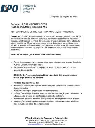 Ela é aposentada e vive de um salário mínimo, com o qual ainda precisa pagar aluguel. Não tem condições financeiras de adquirir uma prótese, que custa R$ 23.800,00. Esse valor inclui também as sessões de fisioterapia, que são fundamentais para que ela possa voltar a andar com segurança e dignidade.