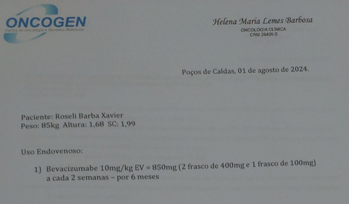 Olá. Meu nome é Kelly. Venho através dessa vaquinha contar com a solidariedade de cada um para a continuidade do tratamento oncológico da minha mãe. Ela é paciente do Dr Tobias no Unacon em Poços de Caldas-MG desde 2021, quando iniciou seu tratamento para Câncer de ovário. Ao longo desses anos ela passou por vários protocolos de quimioterapia, tendo algumas complicações como metástases, tromboembolia e insuficiência cardíaca. Do final do ano pra cá ela passou a sentir muitas dores por conta da evolução da doença (estágio metastático). O marcador tumoral ca125 se encontra acima de 9.500UI/ml.Ela também desenvolveu ascite que é uma complicação comum do câncer de ovário, já sendo submetida a procedimentos de paracentese. Como o câncer progrediu muito, o médico interrompeu as quimios agora em julho. Infelizmente todas as opções de tratamento fornecidas pelo Sus foram esgotadas e agora precisamos de uma medicação chamada Bevacizumabe (Avastin) que é um medicamento de alto custo sendo fornecido através da via judicial. O tratamento da minha mãe vai custar 22 mil por mês durante 6 meses (serão 2 aplicações por mês, 1 a cada 15 dias conforme receita, no valor de 11mil cada c/ desconto).