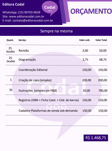 a melhor editora que eu encontrei (Editora Codal) ta cobrando ao todo R$1468,75 com os serviços de Revisão, Diagramação, Coordenação Editorial, Criação de Capa( simples) , Ilustrações (simples em P&B) , Registros (ISBN + Ficha Catal + Cod de Barras) e Cadastro Plataformas de venda sob demanda