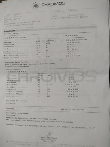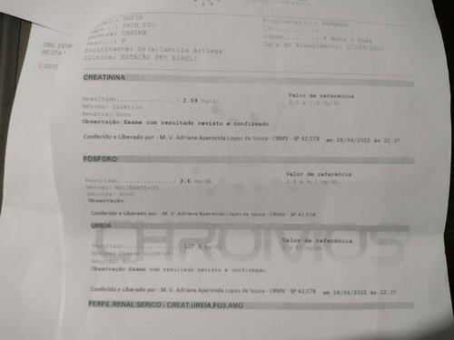 Sofia foi diagnosticada com doença renal crônica após várias convulsões, úlceras na língua e está a muitos dias sem conseguir se alimentar por conta própria. As consultas, exames e medicamentos já sairam muito caros e infelizmente o tratamento será para o resto da vida por se tratar de uma doença progressiva. Além disso, após ela se estabilizar irá passar por outros dois procedimentos cirúrgicos, pois nos exames também foram detectados aumento no útero, um pequeno tumor no baço e alterações na vesícula. A notícia foi inesperada, não estávamos contando com uma doença tão agravante e ainda fomos surpreendidos com os demais problemas de saúde durante os exames. Estamos fazendo o possível e o impossível pela Sofia e contamos com sua ajuda para dar a ela qualidade de vida.