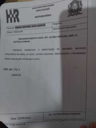 Meu nome é Betânia tenho 64 anos, sofri 3 AVCs e tenho diabetes. Por causa da diabetes já amputei uma perna. Minha filha criou essa vakinha para mim para conseguimos arrecadar o valor de 10000 para realizar o tratamento da minha úlcera na perna direita. Com esse valor vamos custar o tratamento com uma enfermeira especializada em feridas pra salvar minha outra perna, vamos comprar os materiais de curativos e iremos comprar fraudas e suplementos alimentares.