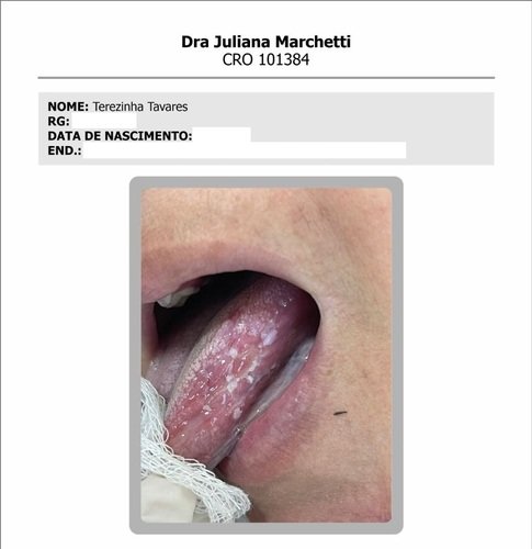 Como ela sempre sofreu com muitas aftas, pensou que poderia ser alguma afta que se complicou e então procurou sua dentista de rotina. A dentista, desconfiada do tipo de lesão, enviou em 09/03 uma biópsia para análise no Hospital do Câncer de Barretos.