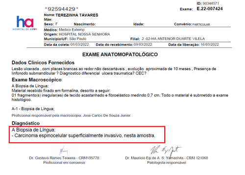 No dia 16/03/2022, o Hospital do Câncer emitiu o resultado da biópsia, confirmando se tratar de um câncer maligno na língua (carcinoma espinocelular).