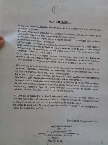 O Evandro está lutando para sobreviver de uma bactéria que dia-a-dia está o destruindo. O diagnóstico é de fístula na região glútea e perianal, que está evoluindo rapidamente para outras regiões. Ele precisa urgentemente iniciar o tratamento de oxigênioterapia hiperbárica, com sessões diárias e sequenciais, e precisa de um total de 100 sessões, ao custo de R$ 44.000,00. Conforme laudo médico, na escala de gravidade USP, ele está classificado no Grupo III, que representa índice de mortalidade de 30%. Há mais de um ano ele está na fila de espera do SUS para o início deste tratamento, que é a única alternativa para ele. Também entramos com liminar judicial e tivemos o pedido indeferido pelo Juíz - 3 vezes.