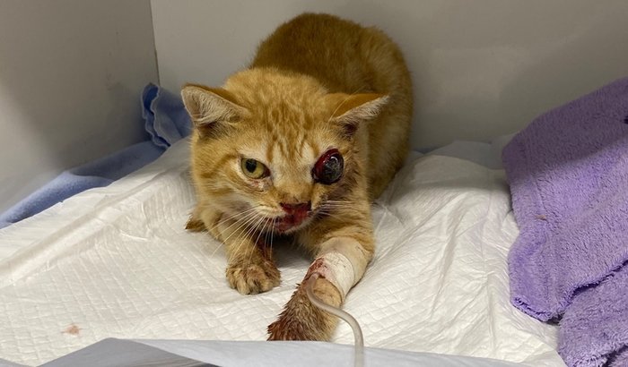 Levamos ao hospital veterinário e ele tem a possibilidade de vida, perderá um olho e se o outro não melhorar e desinchará perderá a os dois olhos.