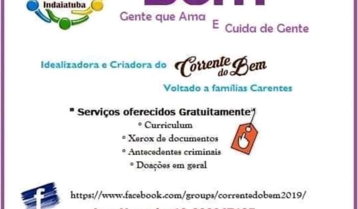 PROJETO CORRENTE DO BEM INDAIATUBA 👉Somos um Projeto de cunho social, criado no ano de 2017, com o objetivo de ajudar e promover campanhas de ajuda a pessoas em situação de vulnerabilidade. Contamos com o apoio e ajuda de pessoas, empresários, amigos e familiares. Atendemos: Famílias carentes Realizamos diversas campanhas durante todo o ano, como arrecadações de alimentos,leite, fralda descartável e geriátrica,móveis, eletrodomésticos,produtos de higiene e limpeza etc. Nas datas comemorativas como Páscoa, Dia das Crianças e Natal realizamos ações, e durante os meses atendemos famílias com ajuda de cestas básicas, roupas, cobertores e diversas ações pontuais. Nosso trabalho é voltado a todos que precisam de ajuda. Como se trata de um projeto sem fins lucrativos,ou seja, Não fazemos bazar e nem rifas para arrecadar verbas,dependemos da ajuda de voluntários e pessoas de bom coração para arrecadar doações diversas para viabilizar o funcionamento e a continuidade do nosso projeto.